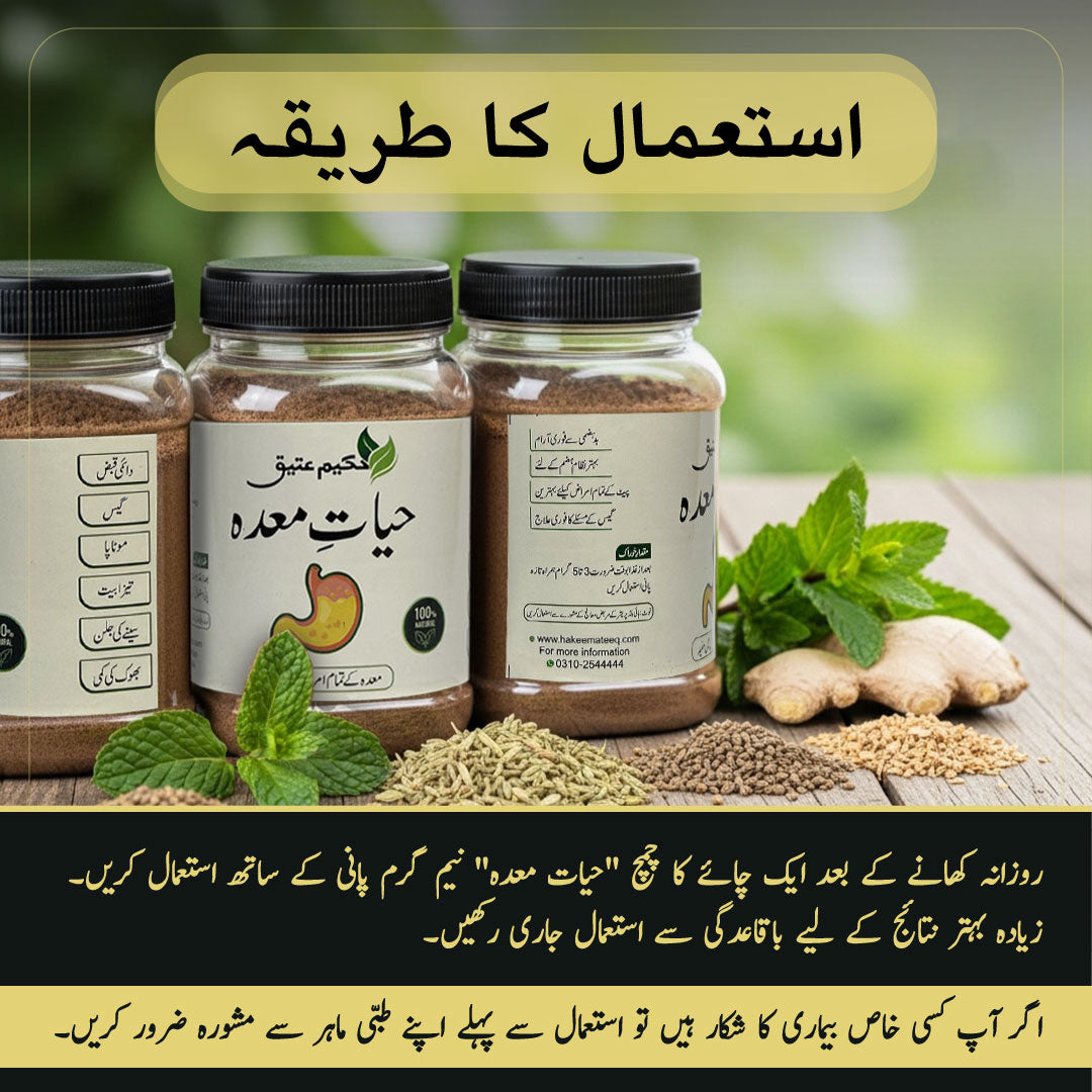 Hayat-e-Maida is a powerful natural digestive tonic crafted by Hakeem Ateeq to provide fast and effective relief from common digestive problems. Whether you're dealing with bloating, gas, indigestion, heartburn, or even low blood pressure, this herbal remedy is designed to restore your digestive balance and bring a refreshing lightness to your body.